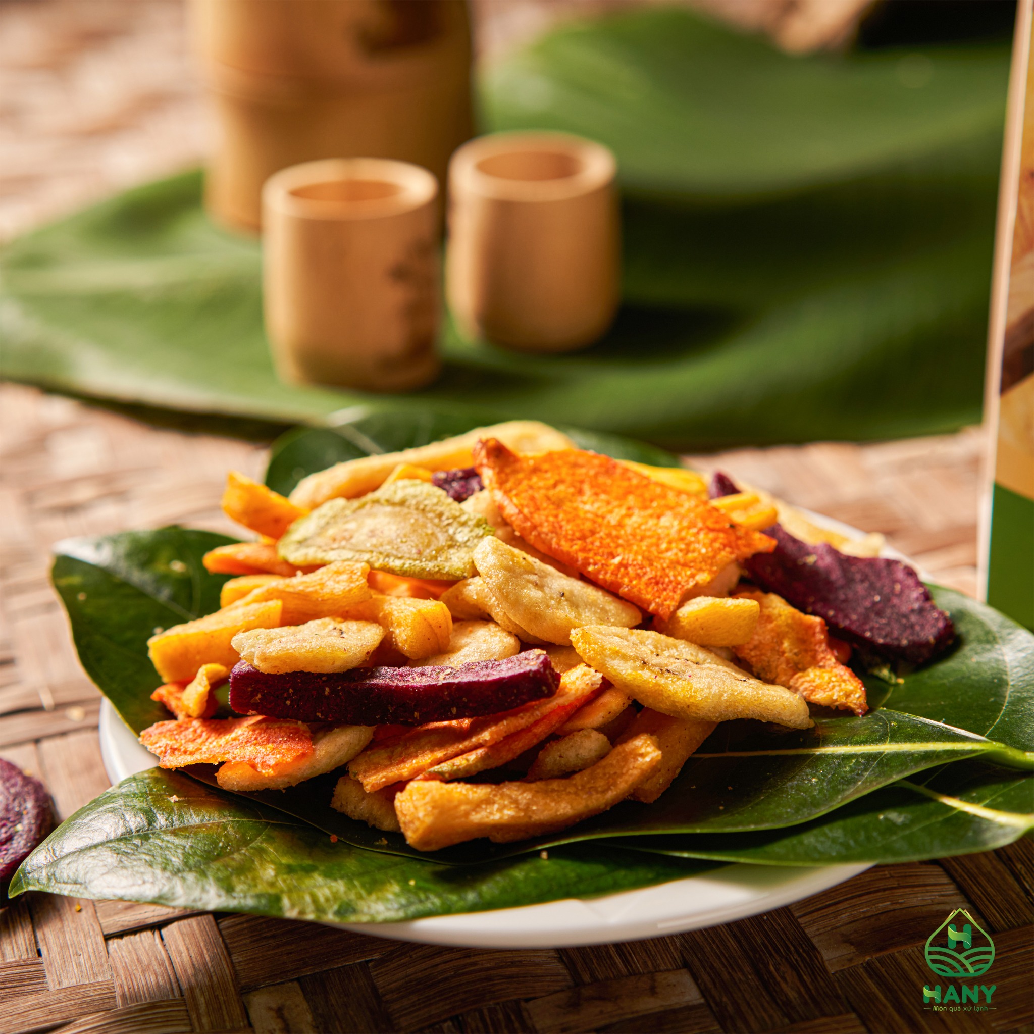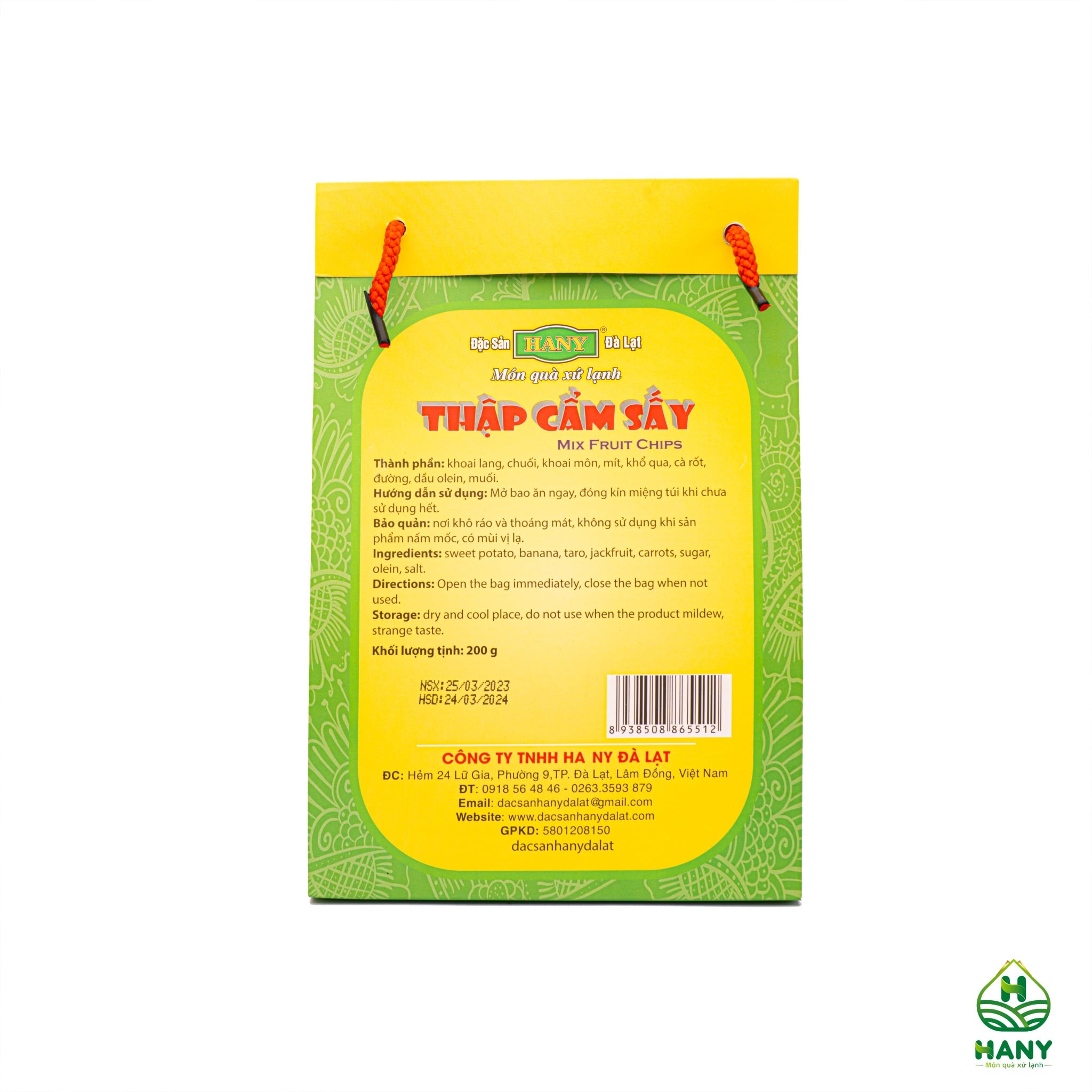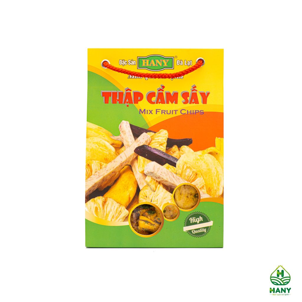 Thập cẩm sấy là một trong những món đặc sản được "điểm danh" đầu tiên trong danh sách yêu thích của du khách khi đến với xứ lạnh Đà Lạt. Thập cẩm sấy HANY được sản xuất 100% từ nông sản sạch Đà Lạt, là sự kết hợp hoàn hảo và đa dạng về hương vị, màu sắc của các loại rau củ quả như: khoai lang tím, khoai lang vàng, khoai môn, mít, chuối, cà rốt, đậu bắp...Không chỉ là món ăn vặt lôi cuốn bởi sự phong phú trong hương vị, thập cẩm sấy HANY còn có mẫu mã đẹp mắt, tiện lợi, thích hợp làm quà tặng cho gia đình, người thân, bạn bè...