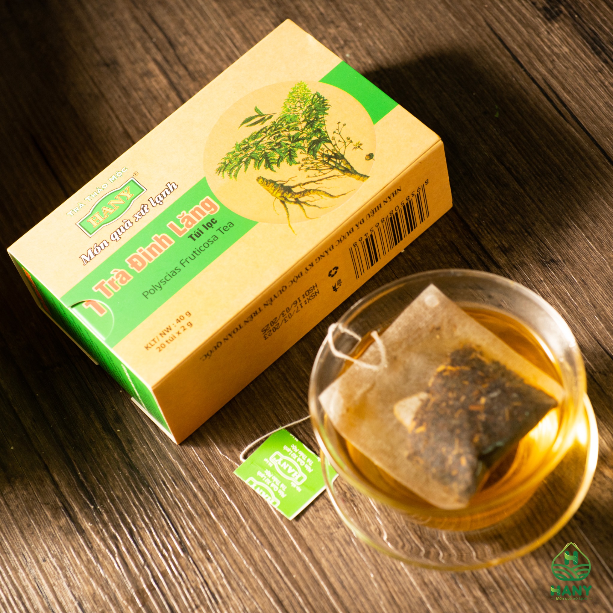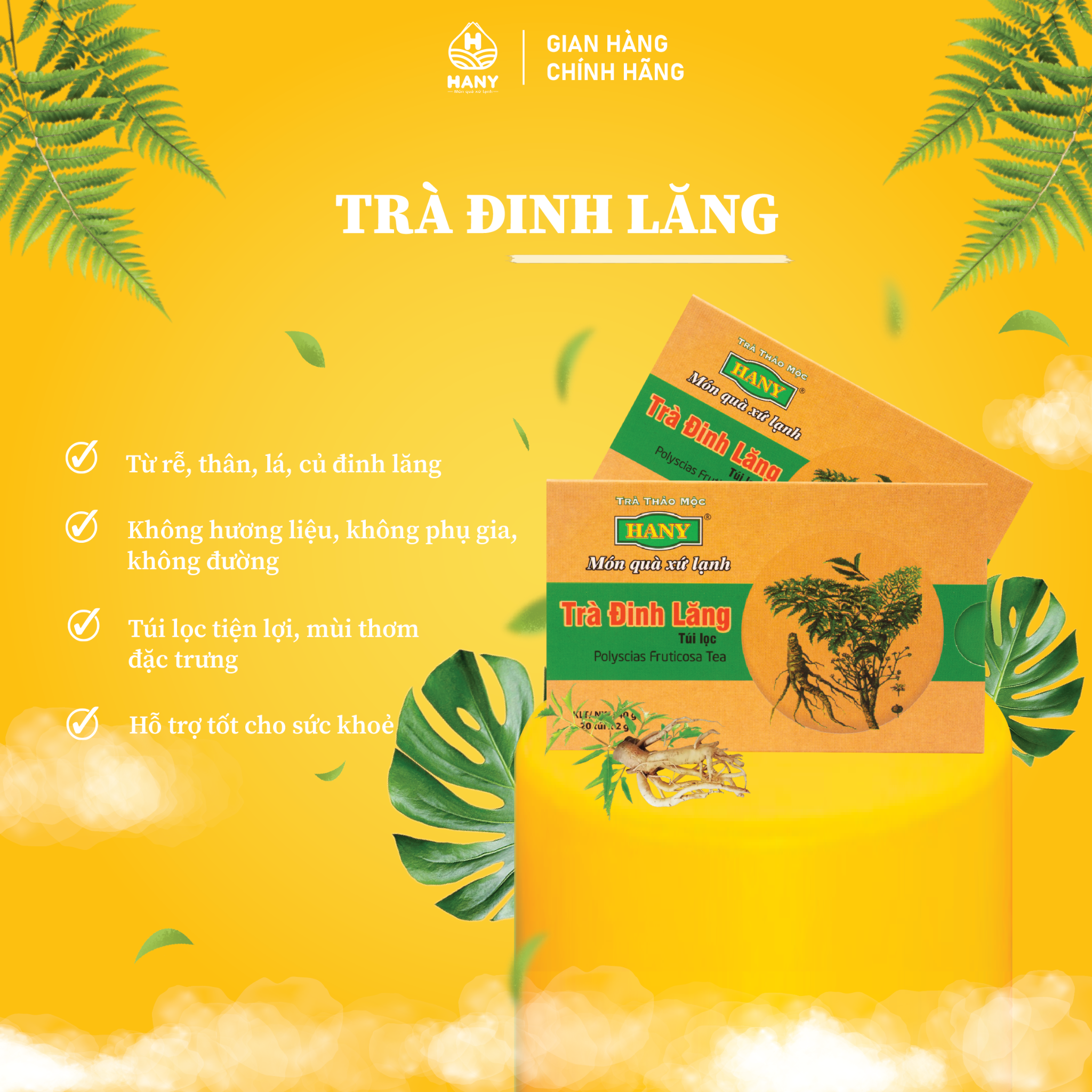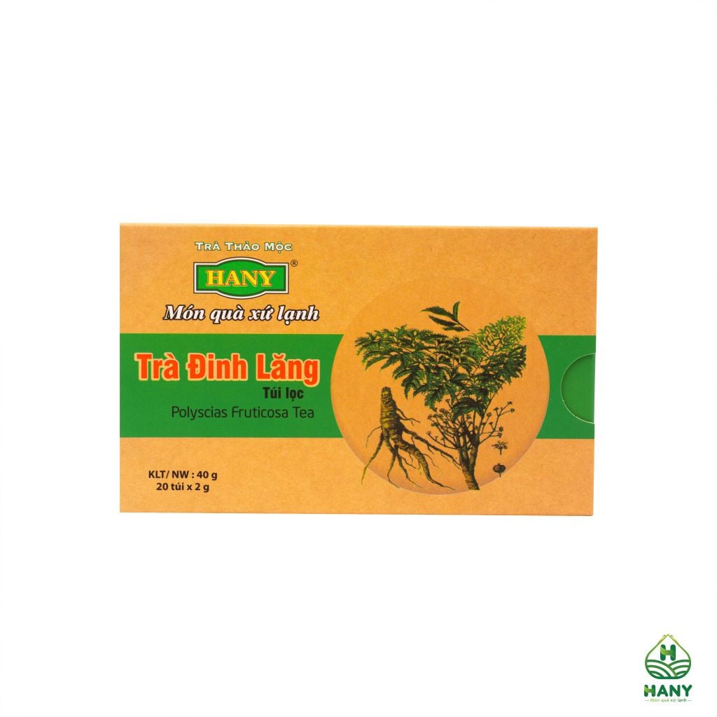 Trà đinh lăng HANY là một trong những sản phẩm trà có công dụng tuyệt vời không thể không nhắc đến trong danh sách trà thảo mộc HANY. Trà đinh lăng HANY được sản xuất 100% từ củ, thân, rễ, lá đinh lăng. Lợi ích trà đinh lăng HANY mang lại cho sức khỏe được đánh giá cao như: bổ huyết, tăng cường tuần hoàn não, giảm các hội chứng tiền đình (đau đầu, chóng mặt, mất ngủ), chữa tê thấp, đau lưng, lợi tiểu, chống dị ứng, chữa ho ra máu...